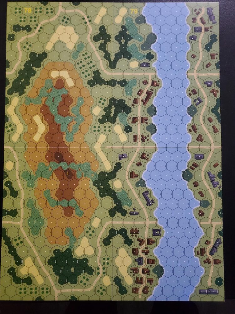 Board 79 is a river board, featuring a four hex river that spans the length of the board. On either side of the river are narrow strips of land cluttered with small wooden and stone buildings (some of it even with “village terrain.” That terrain provides a certain amount of flexibility for this board, allowing it to be easily mated with urban boards, other village boards, or even rural boards without too much cognitive dissonance. ASL could have used another narrow river board, however (there is only one in the system, to date).