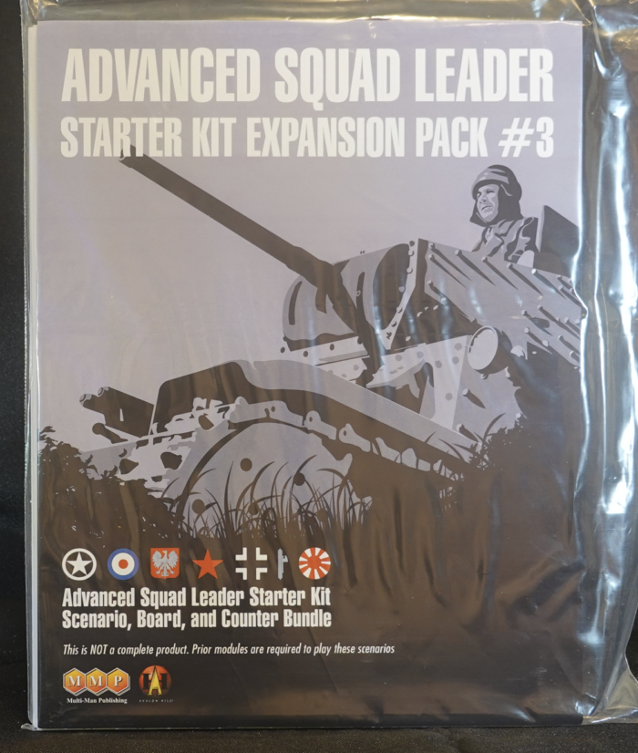 The Advanced Squad Leader Starter Kit Expansion Pack #3, released three years after the series’ second iteration, looks a lot like its predecessor, as well as ASLSK Bonus Pack #2. All three products provide 8 new scenarios for ASLSK, along with new geoboards. The Expansion Packs, however, contain counters as well (and rules for any new vehicles). All require ownership of most previously-published ASL products in order to play the scenarios within.