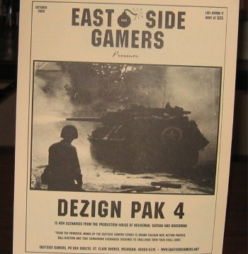 In 2008, the EastSide Gamers (Glenn Houseman, Scott Houseman, and Eric Safran) released their fourth annual scenario pack a ASLOK. Dezign Pak 4 (DP4) contains 15 scenarios, the majority of which were designed by Glenn Houseman.