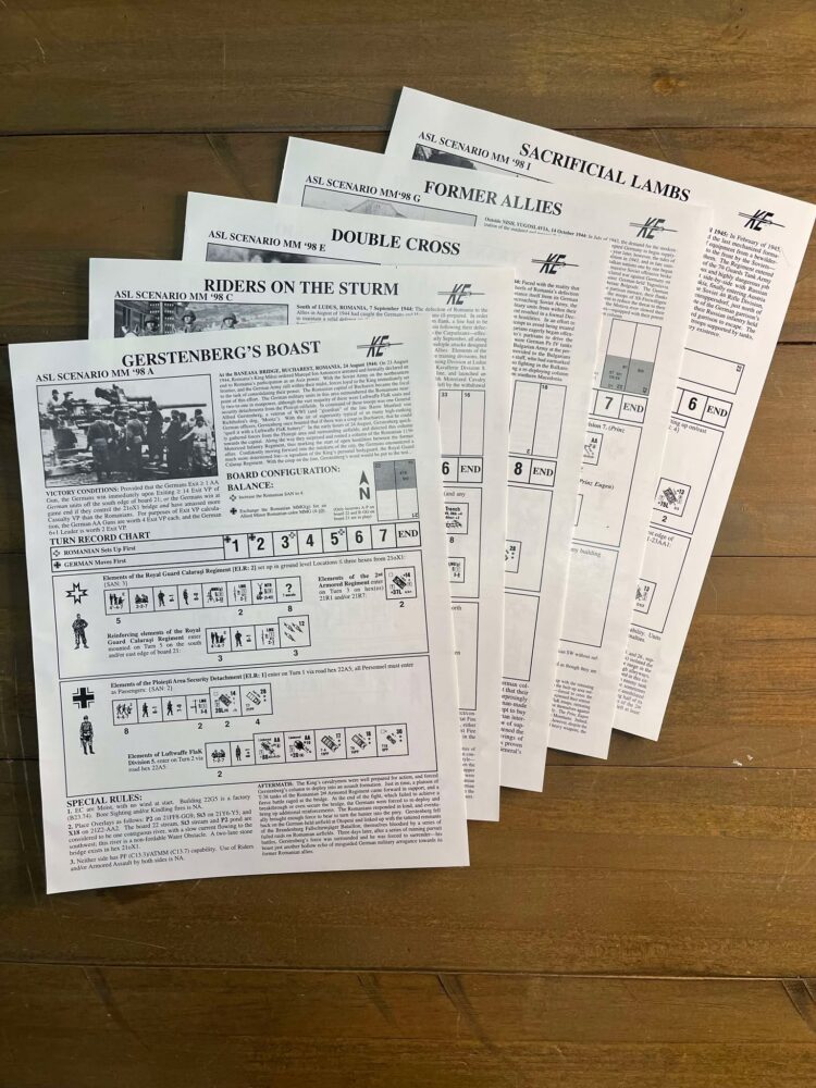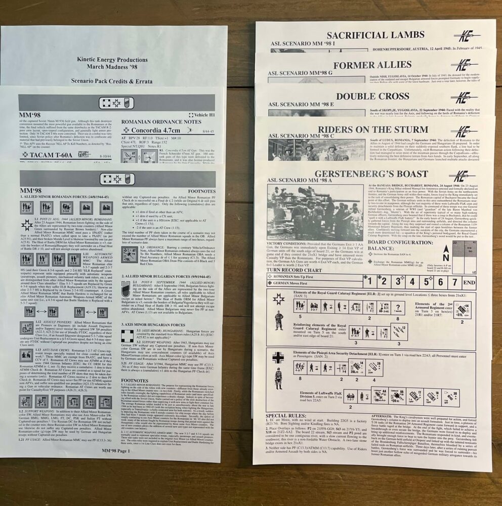 Before there was Armies of Oblivion, there was…nothing. Well, nothing except this one scenario pack, Kinetic Energy’s March Madness ’98 Tournament Scenario Pack, which introduced rules, counters, and scenarios for certain selected late war Axis Minor troops and vehicles. It was given to attendees at the 1998 March Madness ASL tournament in Kansas City, Kansas, but apparently never sold separately. The tiny print run for this scenario pack, combined with the elusive (but always high quality) counters, has made this scenario pack the single most coveted collectible in the ASL world. Copies of the pack appear on E-bay seldom more often than once every couple of years or so, and when they do appear, tend to sell for $350-$450–a high price to pay for 9 scenarios and a small set of counters!