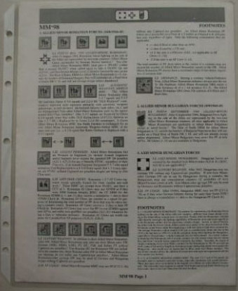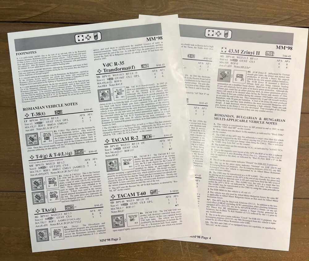 The counters themselves include both 1/2″ counters (primarily 5-3-7 squads and corresponding half squads, representing late war Romanian squads armed with large numbers of SMGs, and 4-3-6 squads and half-squads) and 5/8″ counters (representing Hungarian and Romanian vehicles and ordnance). The scenarios all feature late-war Axis Minors in a variety of circumstances, including Germans vs. Romanians, Romanians vs. Hungarians, and German vs. Bulgarian, to name a few. Because the pack is so rare, none of the scenarios have any particular reputation for balance or imbalance.