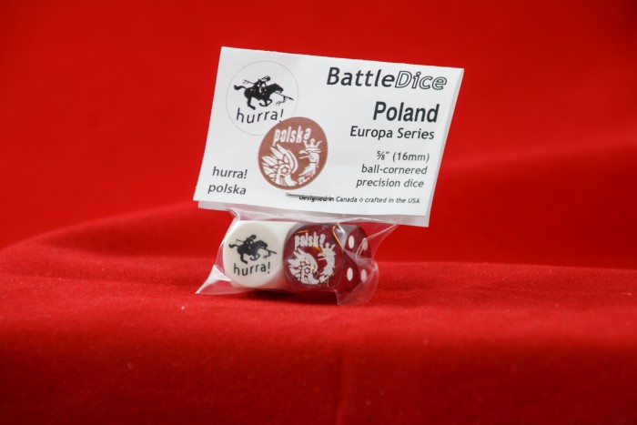 “Poland” is a 2014 entry in Battleschool’s Europa/Pacific series of nationality-themed precision dice. Each set consists of 2 5/8″ (16mm) custom precision dice representing a combatant in World War II.