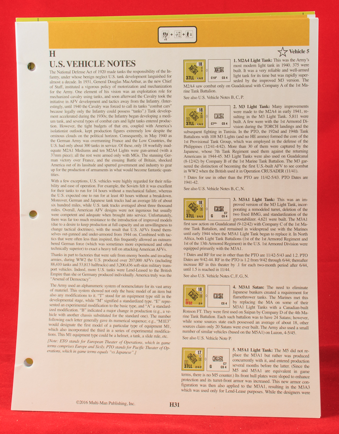 Yanks no longer comes with Chapter E rules but does still come with the Chapter H (i.e, AFV/Gun notes) for the Americans, or at least the non-PTO parts of the American OB.  As with all MMP re-dos, the rules pages were changed to have a slightly larger font, which really improves readability over the original. Any errata noticed in the original was also corrected, while “See also U.S. Vehicle Notes X, Y, Z” directions were added for all AFVs and Guns with relevant multi-applicable vehicle notes–again, much more user-friendly than the original.