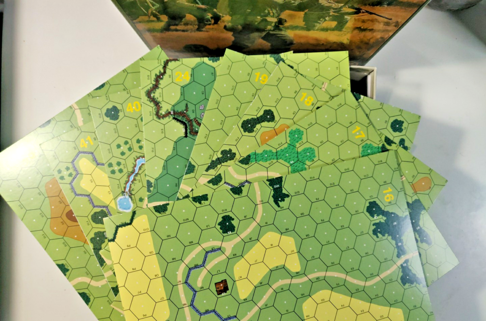 Yanks also comes with 8 8″ x 22″ geoboards (16, 17, 18, 19, 24, 40, 41, 46).  Unlike the original Avalon Hill Yanks boards, which were mounted, these boards are all unmounted (i.e., printed on thick cardstock), as has been the MMP practice for over a decade now. Though some grognards may still grumble about the disappearance of the mounted mapboard, the bulk of the ASL community seems to have been won over to the newer style of board, which is more lightweight, has more consistent artwork from board to board, is more directly mateable, and which is also less expensive.